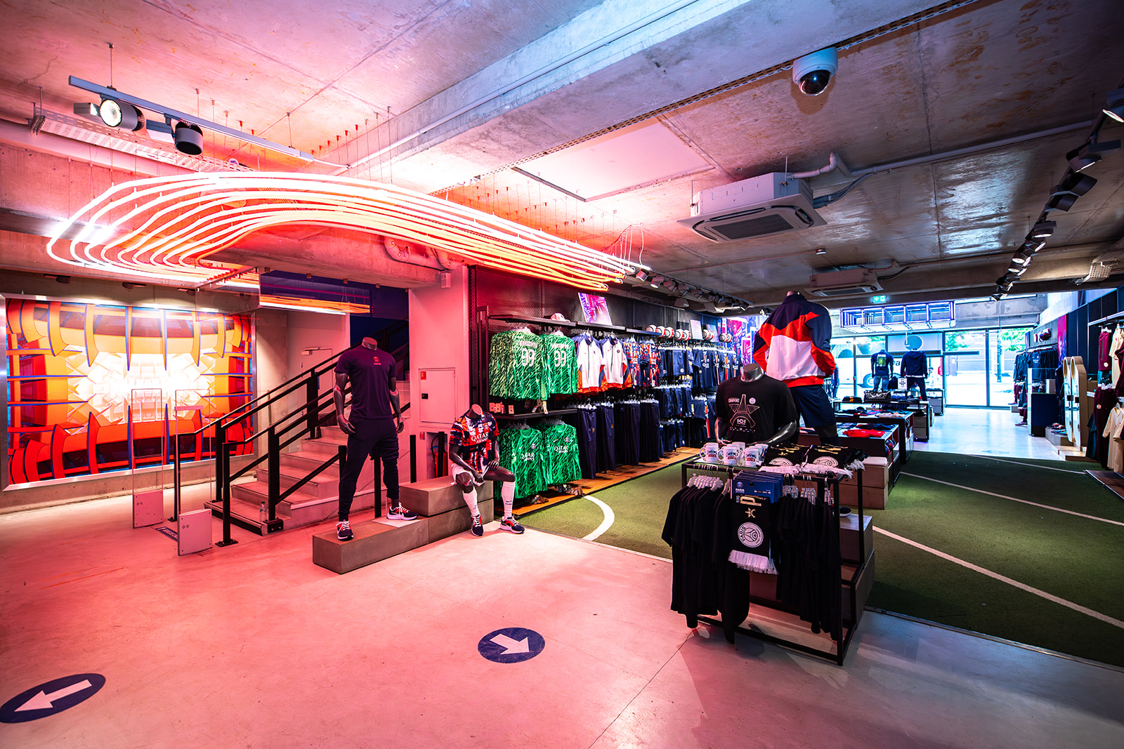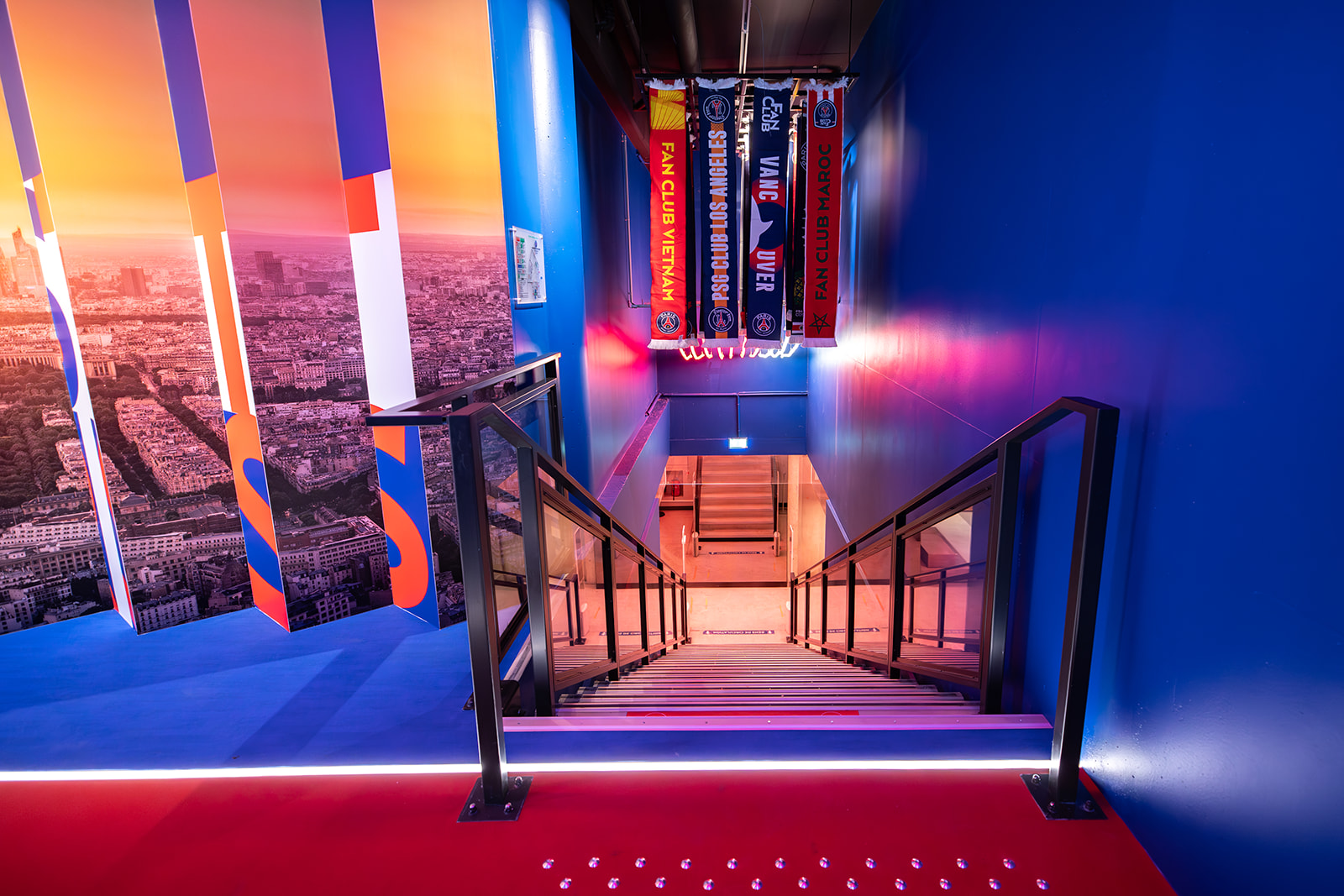The store's signature feature is an illuminated swoosh on the ground floor that guides visitors upward to a replica team tunnel—the same passage PSG players walk through before matches. Complete with the club's atmospheric red and blue lighting, the tunnel builds anticipation before fans emerge onto real turf, experiencing what it's like to step onto the pitch at Parc des Princes.